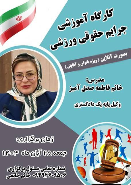 کارگاه آموزشی جرایم حقوقی ورزشی به صورت آنلاین ویژه بانوان و آقایان در زمان جمعه ۲۵ آبان ماه ۱۴۰۳ توسط خانم فاطمه صدق آمیز، وکیل پایه یک دادگستری برگذار خواهد شد.